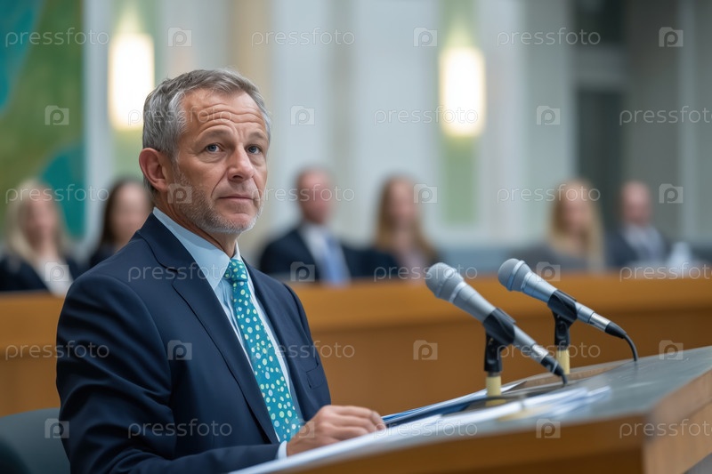 Спикер выступает с речью с трибуны на официальном мероприятии