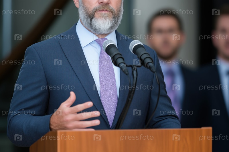 Крупный план пожилого мужчины, произносящего речь с трибуны