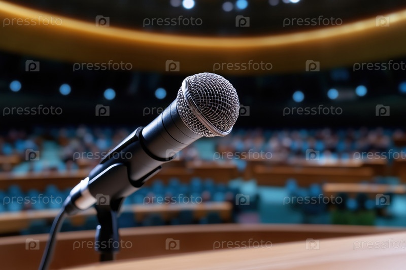 Микрофон на сцене в конференц-зале или комнате для семинаров, концепция публичных выступлений