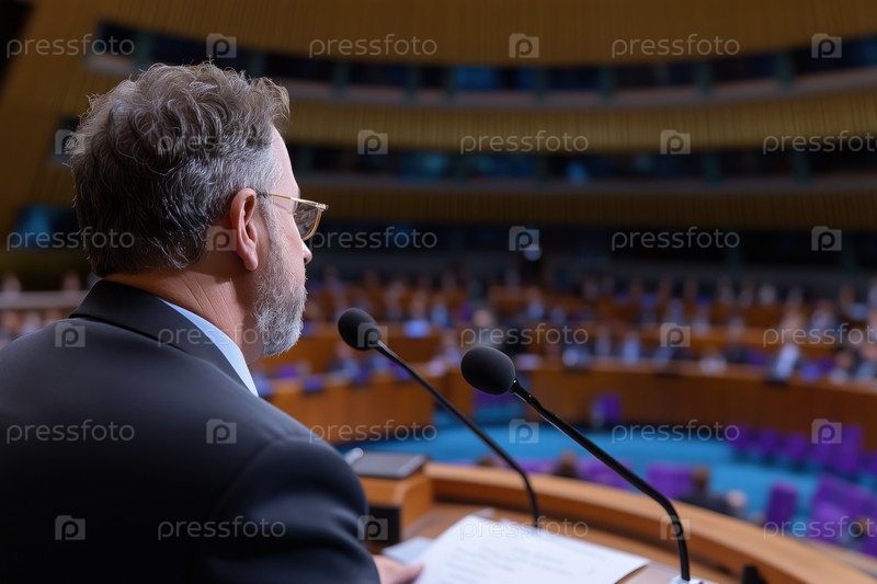 Вид сзади: пожилой мужчина в официальной одежде на трибуне произносит речь в конференц-зале
