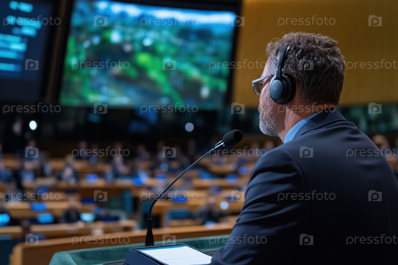 Старший диктор-переводчик в наушниках с микрофоном в большом конференц-зале