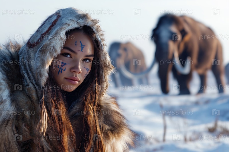 Портрет красивой молодой женщины в шубе на фоне мамонтов