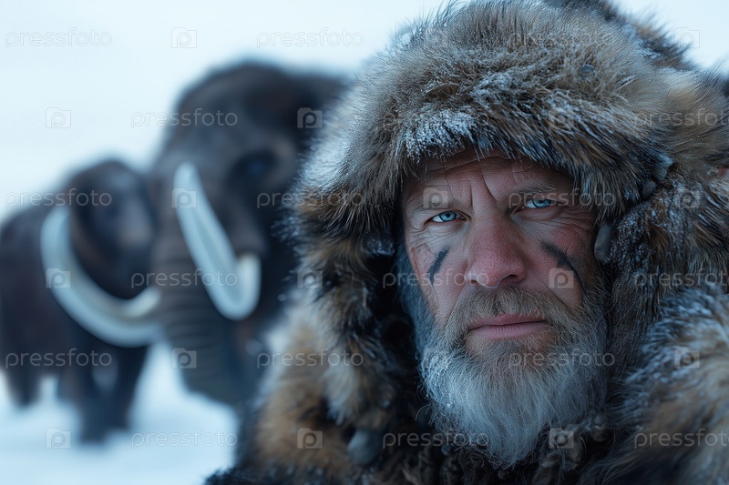 Портрет мужчины с длинной бородой в шубе на фоне мамонтов