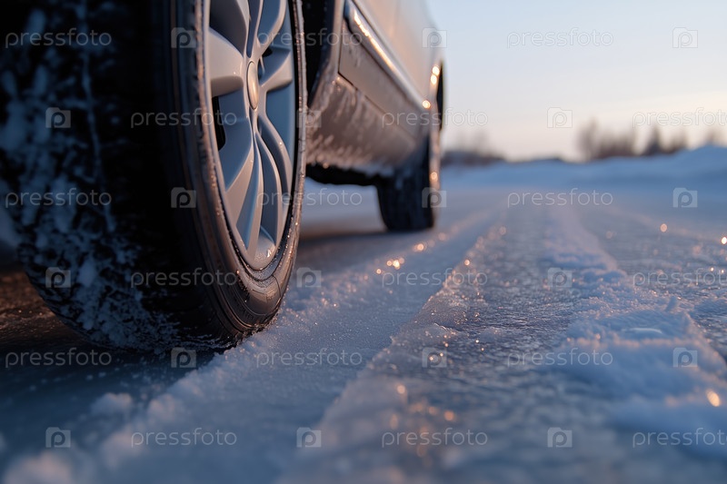 Автомобиль на обледенелой дороге зимой. Зимние шины крупным планом