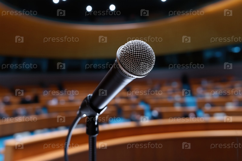 Микрофон в конференц-зале или комнате для семинаров с размытым фоном