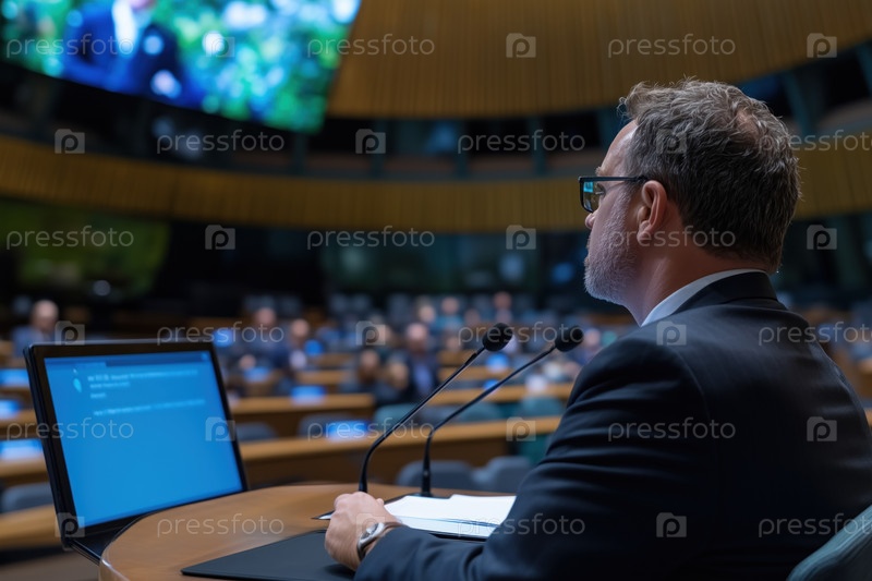 Вид сзади зрелого оратора или переводчика в конференц-зале