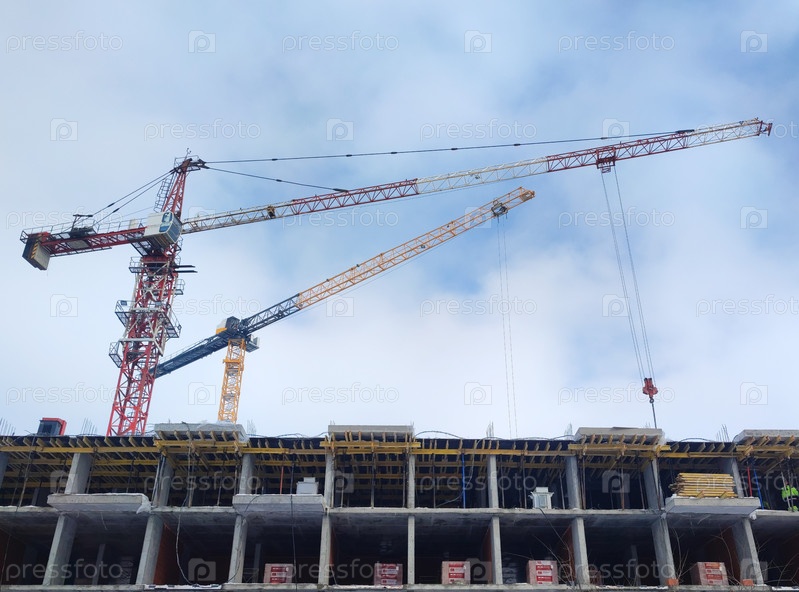 Строительный кран на стройке поднимает груз на строительную площадку многоэтажного дома на фоне голубого неба.Строительный кран на стройплощадке поднимает груз на строительную площадку многоэтажного здания на фоне синего неба