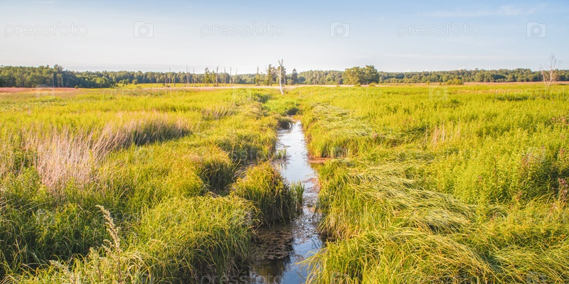 Заросшая река среди поля травы