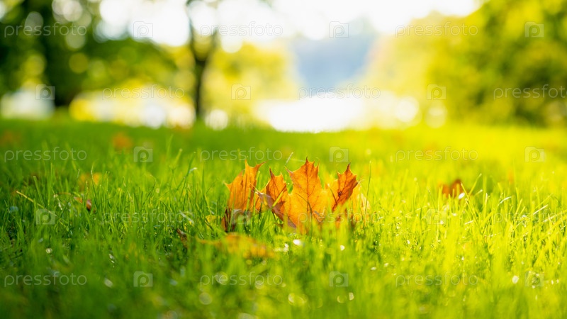 Опавшие желтые листья на траве под ярким осенним солнцем