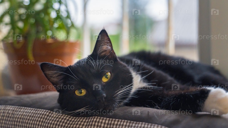 Черно-белый кот на подоконнике