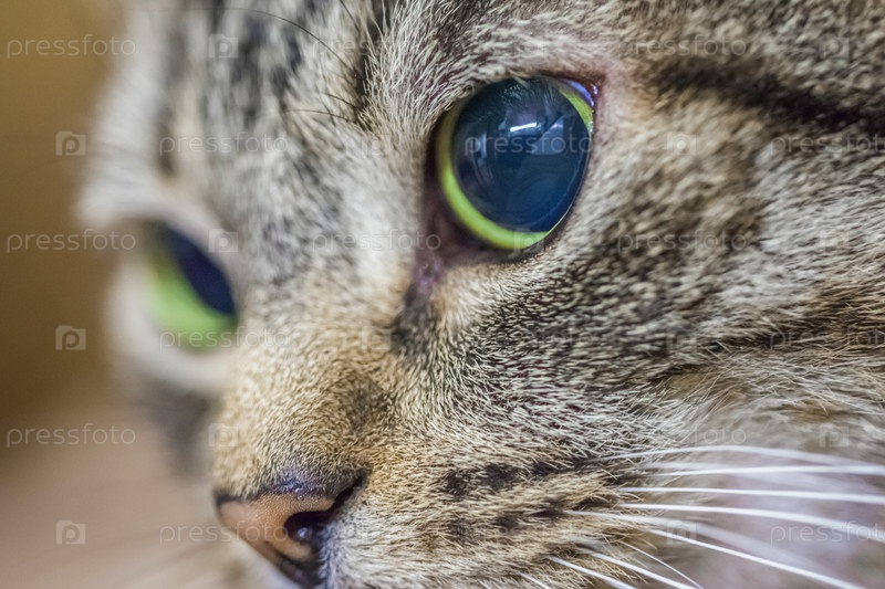 Морда полосатой кошки с большими глазами, крупный план, мягкий фокус