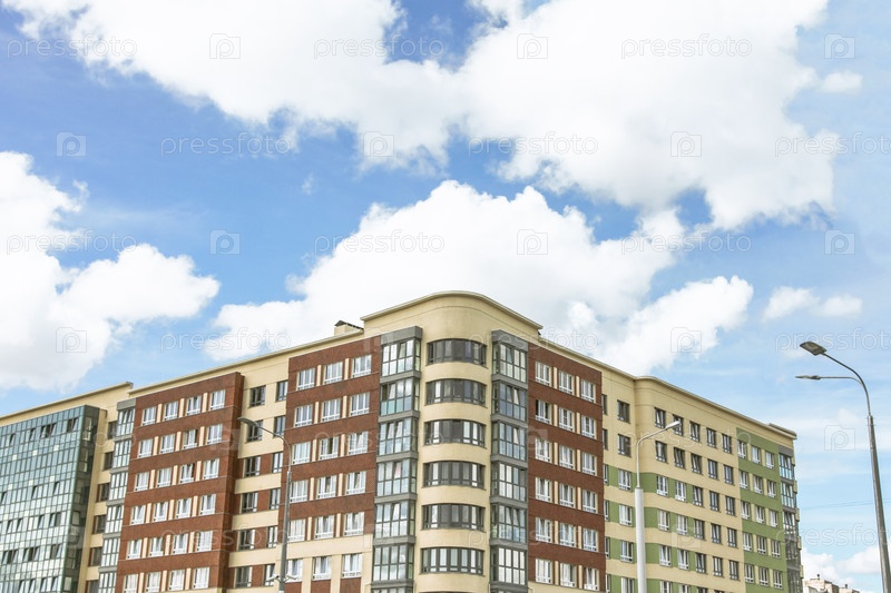 Часть современного многоквартирного дома в солнечный полдень, на фоне голубого неба и белых облаков