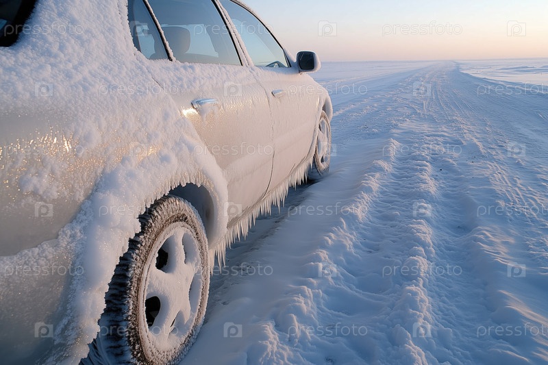 Автомобиль, засыпанный снегом, на зимней обледенелой дороге в сугробе
