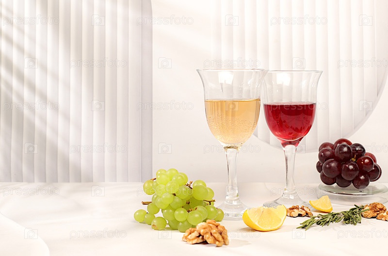 Дегустация благородных сортов красного и белого вина в бокалах с сортами винограда, орехами и розмарином, концепция дегустации вин и летней вечеринки. Рекламный баннер для кафе и ресторана, современный натюрморт,