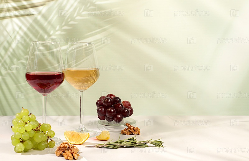Современный натюрморт с бокалами белого и красного вина, алкогольным коктейлем Маргарита и виноградом на фоне с длинными жесткими тенями, минималистская концепция для бара, кафе, рекламного баннера,