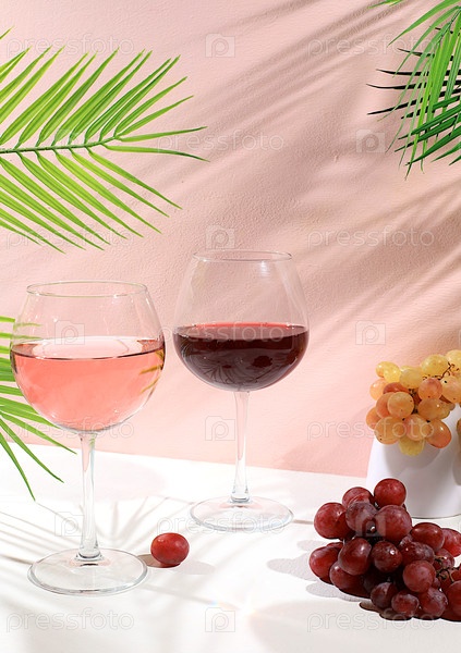 Современный натюрморт с бокалами белого и красного вина, алкогольным коктейлем Маргарита и виноградом на фоне с длинными жесткими тенями, минималистская концепция для бара, кафе, рекламного баннера,
