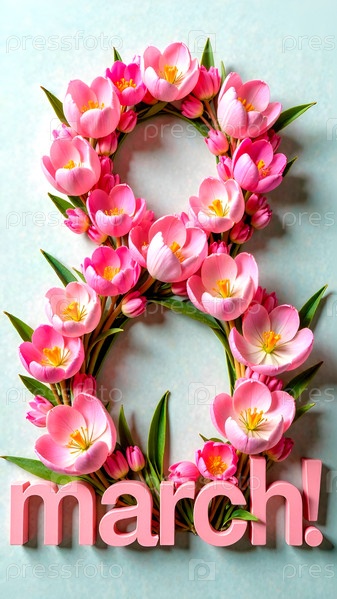 Надпись 8 марта составлена из розовых тюльпанов. Международный женский день