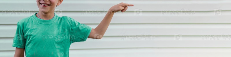 Макет с неузнаваемым ребенком, показывающим направление. Копировальное пространство, пустая стена. Мальчик улыбается