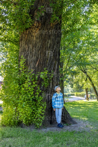 Мальчик предподросткового возраста в синей толстовке стоит под большим деревом и мечтательно смотрит вверх. Общение с природой, самопознание юности