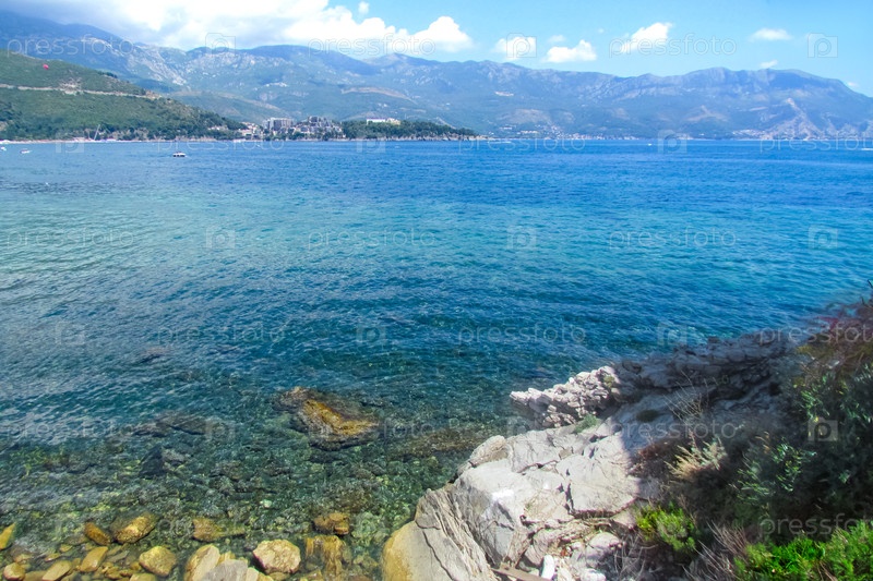 Вид на Адриатическое море в солнечных бликах, переливающееся разными оттенками от синего до бирюзового и камни в прозрачной воде. Город в горах вдалеке. Черногория