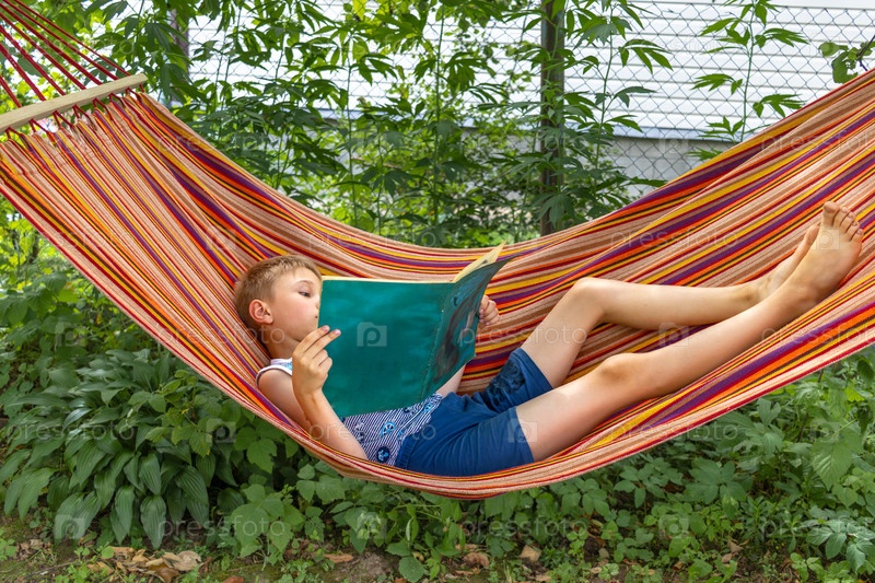 Школьник лежит в гамаке и читает книгу в саду солнечным летним днем