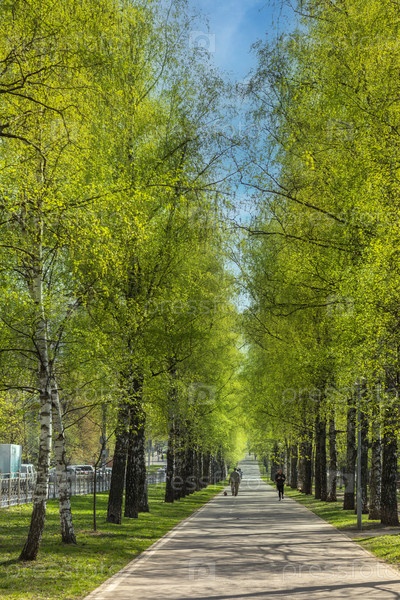 Березовая аллея весной в городе с гуляющими людьми. Атмосфера весны, первая зелень