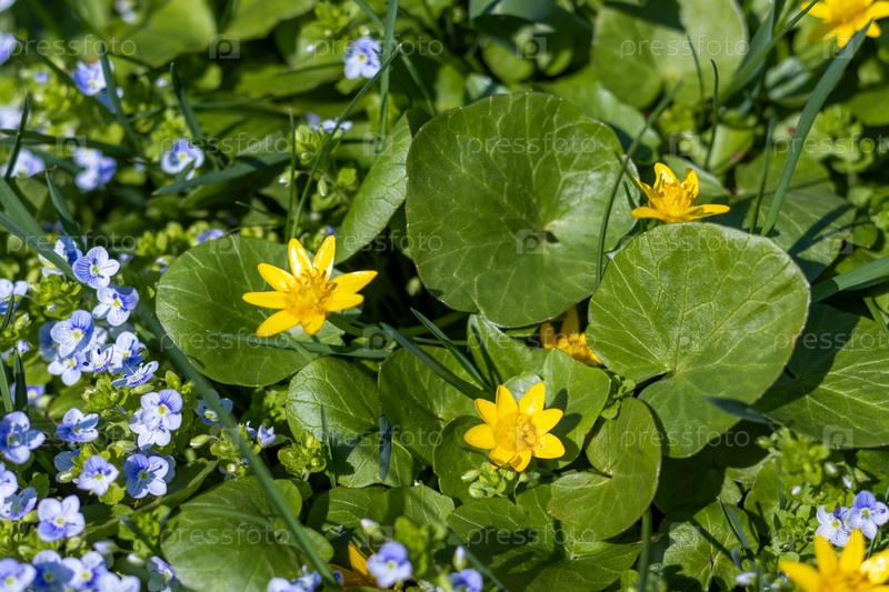 Весенние лесные первоцветы желтые и синие. Крупный план. Калужница и вероника дубравная. Красота в природе