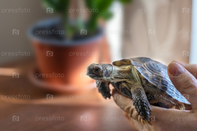 Сильные мужские руки нежно держат черепаху. Привязанность к питомцу. Крупный план. День черепахи