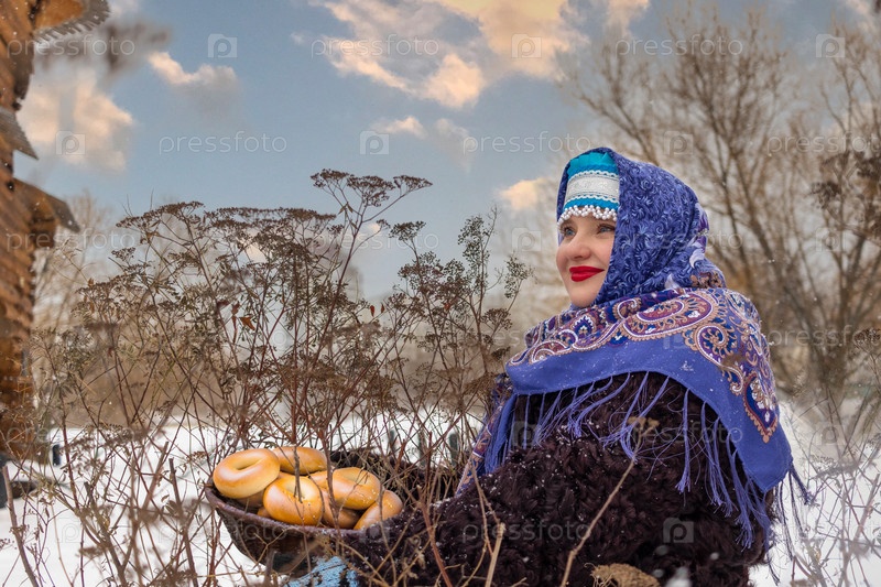 Добродушная русская женщина в народном костюме - шубе, шали, кокошнике и варежках поздравляет с Масленицей и началом Великого поста. Русский стиль