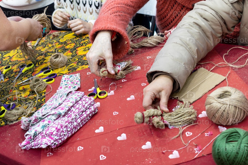 Руки пожилых женщин, занимающихся рукоделием, изготовлением кукол из ниток
