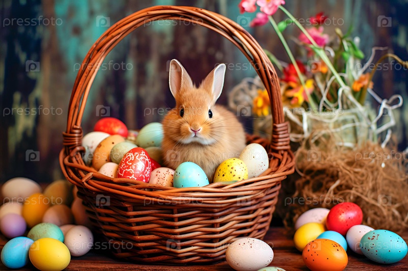 Пушистый кролик в корзине и пасхальные яйца. Счастливой Пасхи открытка. деревенский стиль