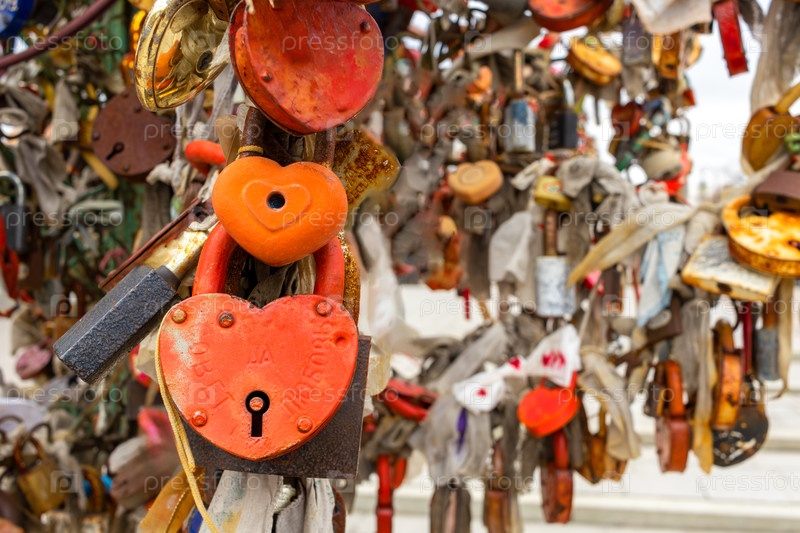 Множество красных замков в форме сердца, чтобы скрепить отношения пары. Обычай, традиция, примета, суеверие