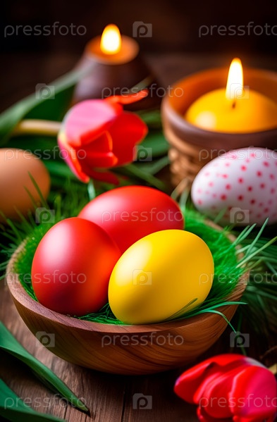 Пасхальная открытка в темном ключе с крашеными яйцами в деревянной миске с травой, красными тюльпанами, свечами. Деревенский стиль. Крупный план