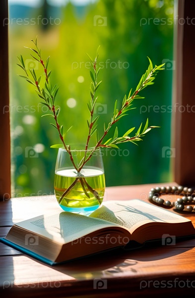 Ветки с первыми листьями в вазе, четки и открытая духовная книга у окна в солнечный весенний полдень. Великий пост. Молитва, созерцание, забота о душе