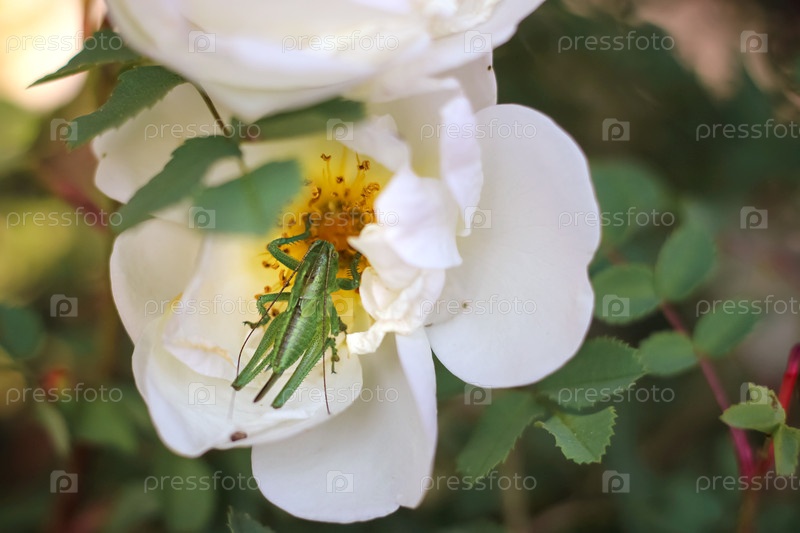Зеленая саранча на цветке шиповника в летнем саду питается нектаром. Борьба с вредителями. Крупный план. Красота в природе