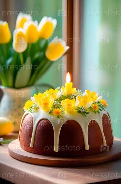 Пасхальный кулич, украшенный цветами и зажженной свечой, в солнечный весенний день, у окна. Желтые тюльпаны. Теплый весенний день. Русский стиль