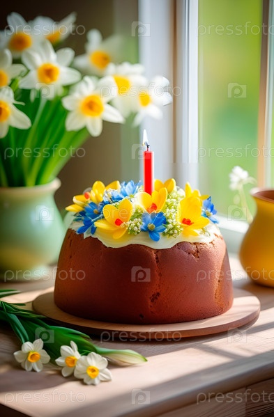 Пасхальный кулич, украшенный цветами и зажженной красной свечой, в солнечный весенний день, у окна. Белые нарциссы. Теплый весенний день. Русский стиль