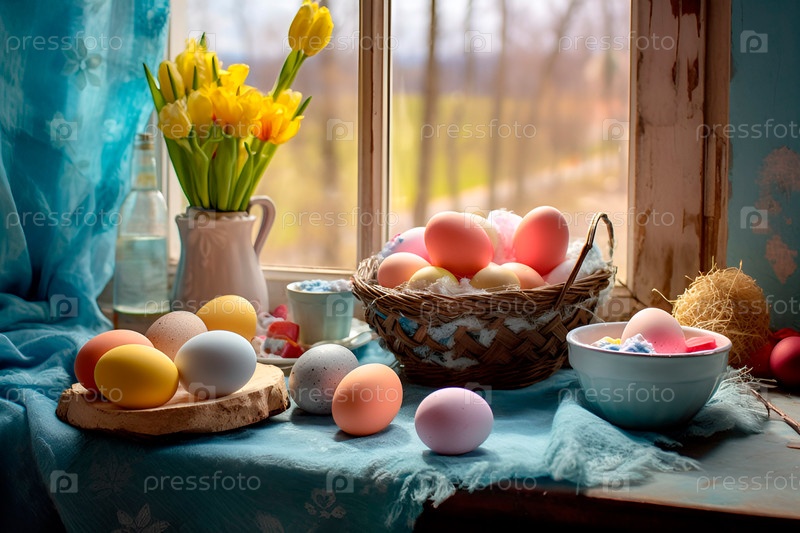 Окрашенные розовые, желтые и голубые яйца в корзине на кухонном столе у окна на фоне весеннего пейзажа за окном и желтых тюльпанов в вазе. Подготовка к Пасхе. Деревенский