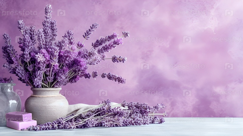 Фиолетовый фон с букетом лаванды и мылом ручной работы. Прованс, деревенский стиль. Копировальное пространство, место для текста