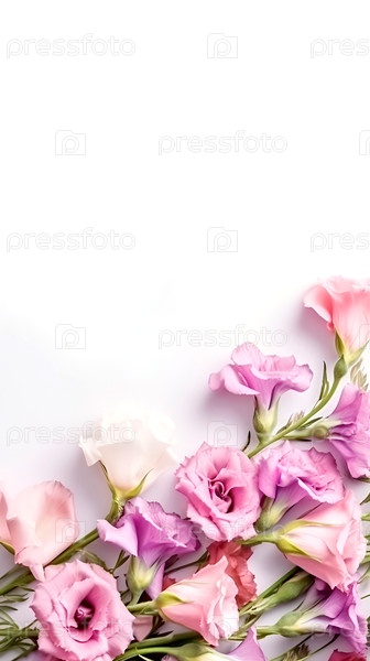 Розовые цветы эустомы на белом фоне. место для копирования, место для текста, шаблон, макет, макет