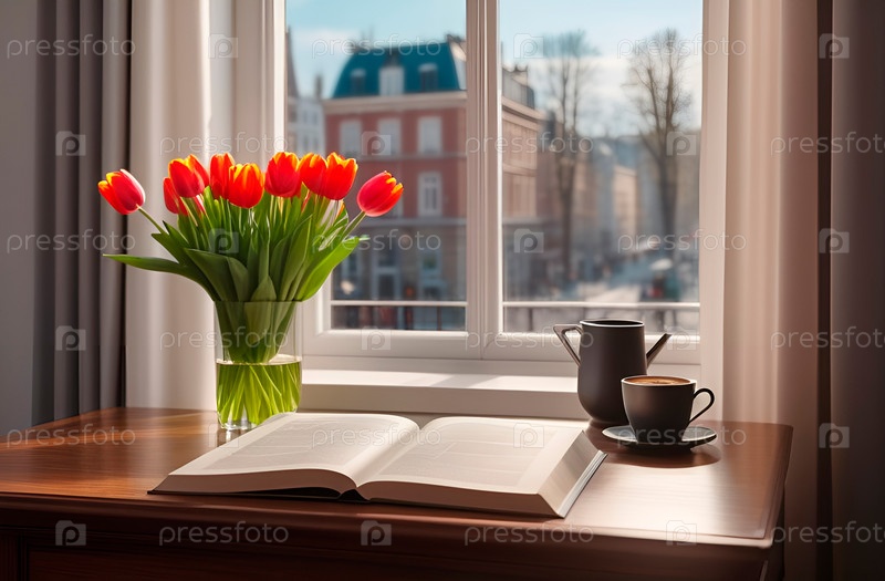 Утренний натюрморт. Книга, кофе и тюльпаны в вазе на столе у окна, за которым виден весенний городской пейзаж. Идея уюта, хюгге, домашнего комфорта