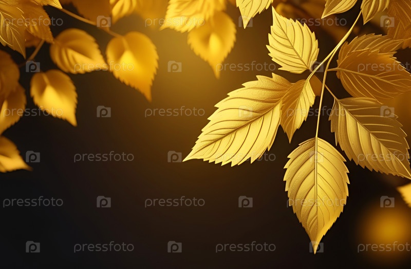Коричневый фон с золотистыми листьями, подсвеченными солнцем. Осень, осенние праздники, День благодарения. Копировальное пространство, текстовое пространство, шаблон, макет, макет