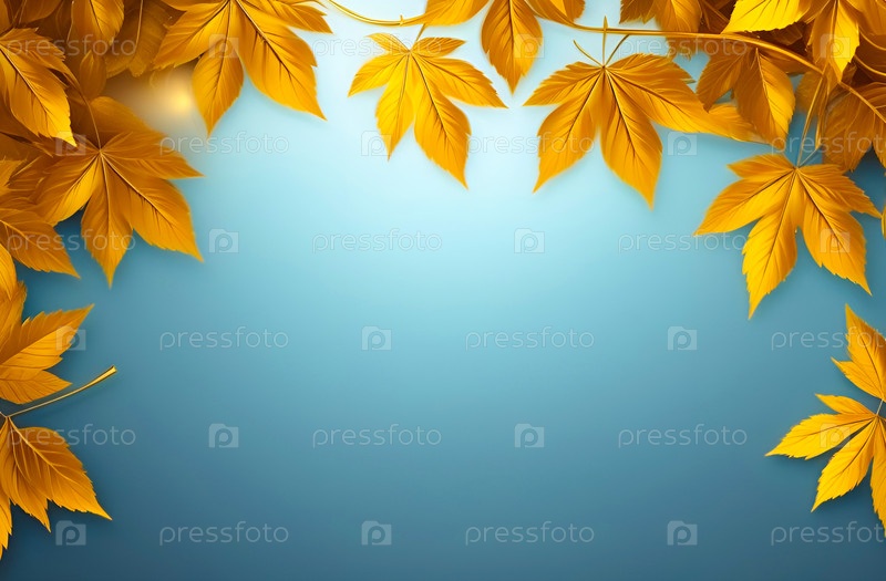 Рамка из золотых листьев ясеня на голубом фоне. Осенний фон. пространство для копирования, текстовое пространство, шаблон, макет, макет