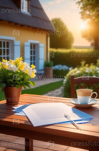 Листы для записей, ручка и кофе на столе в загородном саду рядом с деревенским домом. Вид на сельскую идиллию с цветущими садами. Уютно и тихо