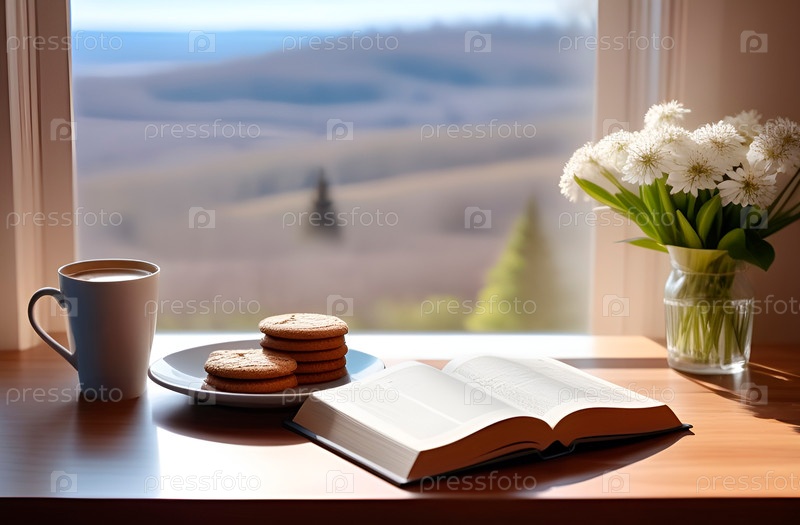 Книга, кофе и печенье, и букет белых цветов у окна с ранним весенним пейзажем за окном. Тихая роскошь повседневной жизни. Утро в сельской местности