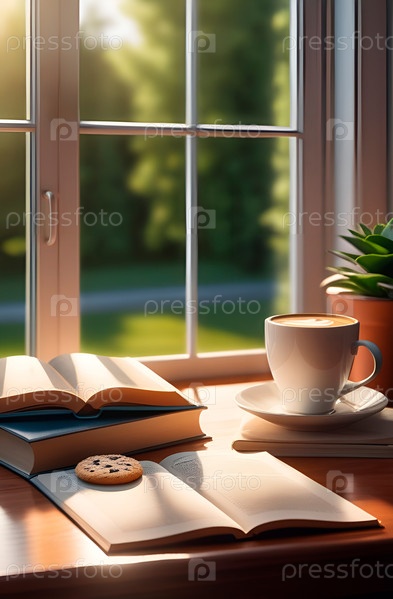 Книги, учебники, чашка кофе у окна с летним пейзажем. Подготовка к экзаменам, учеба