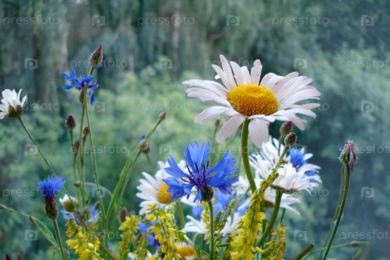 Полевые цветы - ромашки, васильки крупным планом на фоне зеленого леса. лекарственные травы. Открытка. место для копирования, шаблон, макет, макет