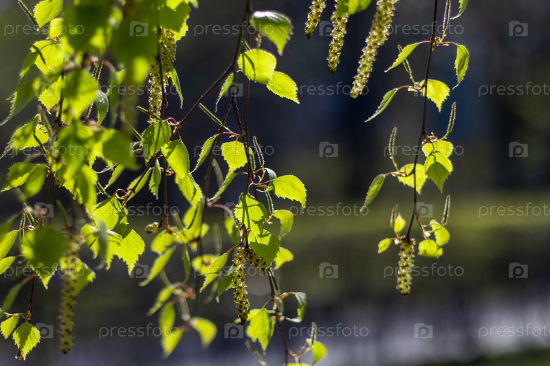 Березовые ветки, сережки и первые листья светятся на солнце майским вечером. Весеннее настроение. Темный фон. Контрасты