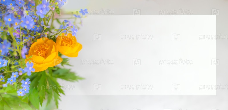 Поздравительная рамка с весенними цветами - незабудками и купальницами. Макет, шаблон, мокап, место для копирования, место для текста. Баннер