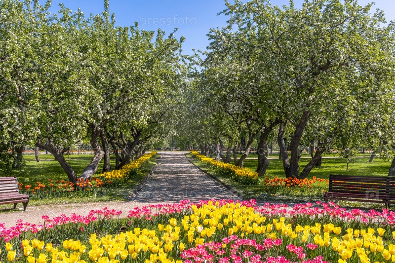 Цветущие яблони и тюльпаны в парке солнечным весенним днем